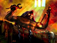 Még megfelelő a távolság - felhúzol egy hhaar burka varázslatot. Morgan szilánkja gyógyít (+2 életpont). A halálraítélt, aki veled szemben áll, küszködik életéért: elmormol egy láthatatlan védekező varázst. Mélyen koncentrálva, megidézel egy Tharr haragja varázslatot, majd ellenfeledre küldöd. 72 életpontot sebeztél. A szilánk működik (+2 életpont). Ellenfeled néhány elegáns kézmozdulata után már süvít is feléd egy mágiatörés. Semmi hatás! Ellenfeled egy kézmozdulatot tesz, majd ellő egy a hatalom szava varázslatot. Bűvös shurikent markolva becélzod a mozgó célpontot. Elrepül 5 bűvös shuriken. Alaposan megsorozod a Notermanthi nyakát. (5 támadással 247 életpontot sebezve.) Yeeee! Lenyomtad az ellenfeledet, esélye sem volt.