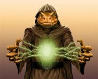 (Továbbmész...) [262,117] A terep továbbra is ritka erdő. Megtorpansz, mert valami felkelti a figyelmedet. Aha! Találtál egy manilla-fát. Találsz egy teljesen lerombolt oltárt. Nyilván valamilyen gonosz fickó műve. Utad során egy különös szoborra bukkansz, ami apró, színes porszemek kavargásából épül össze. A szobor Chara-din egy hívét ábrázolja, amint alamizsnáért kuncsorog Emella a Bombázó előtt. Azonnal észreveszed a feléd tartó lényt. Kissé összehúzod a szemed, hogy jobban lássál. Á, csak egy sötét kaszás. Rögtön látod, hogy ez nem lesz békés találkozó. Felkészülsz az összecsapásra.