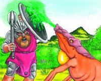 [192,105] A síkságot ritka erdő váltja fel. Ahogy cammogsz, egyszercsak hogy, hogy nem: kiszúrsz egy rúnakövet. Az auráját megvizsgálva rájössz, hogy ez feltehetően Fairlight rúnaköve. Észreveszel egy teljesen lerombolt oltárt. Nyilván valamilyen gonosz fickó műve. Felfedeztél egy szent tölgyfát. A táj egyhangúságát egy különös szobor töri meg. Milliónyi színes porszem kavargásából a következő kép bontakozik ki szemed előtt: Saját magadat látod a szobor tövében békésen pihenni, a háttérben Skinhead irtja Chara-din híveit, mintegy vigyázva az álmodat. Megtorpansz, mert valami felkelti a figyelmedet. Aha! Találtál egy rát-fát. Egyszercsak megtorpansz. Hohó, nicsak, mit fedeztél fel: egy gyilkos csalánt. Ahogy sétálsz, egyszercsak megragadja valami a figyelmedet. Megvizsgálod közelebbről: találtál egy borkonyó cserjét. Felfedeztél egy fekete lótuszt. Megtorpansz, mert valami felkelti a figyelmedet. Aha! Találtál egy fekete kaktuszt. Szemedet összehúzva előrekémlelsz: igen, jól látod, találtál egy álomvirágot. Épp virágzik! Begyűjtesz 1 álomport. Gyanús mozgást látsz a fák között. Már távolról sem tűnik túl veszélyesnek a szörny. Amint közelebb ér, rá is ismersz. Egy kentaurusz. Legjobb védekezés a támadás, kiáltod, és már ugrasz is.