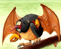 KARDSZÁRNYÚ POCOK (152. SZÖRNY)A kardszárnyú pocok nagytestű ragadozó, hosszú, rövid távú siklásra alkalmas kardszárnyakkal. Az alanori bölcsek szerint sötét, fekete mágikus rituális során hozták létre ezt az ölésre kiképzett, folyton a más élőlények vérére szomjazó szörnyet. A kardszárnyú pocok hihetetlenül fürge, ezért bármilyen fegyverrel is igen nehéz eltalálni. Emellett - talán mágikus örökségének köszönhetően - regenerálja a kapott sebeket. Általában fojtogató nyelvével szokott támadni, majd különlegesen éles kardszárnyaival közelebb tornászva magát, a szárnyak alatt rejtőző óriási, kitines borítású ollókkal próbálja ellenfelét felszabdalni. |