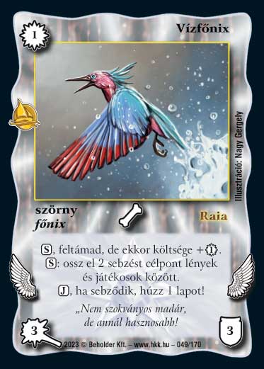 Kiadás: Hódítások Gyakoriság: ritka Lapszín (isten): Raia Típus: szörny Altípus: főnix Szöveg: (S), feltámad, de ekkor költsége +1_VP. (S): ossz el 2 sebzést célpont lények és játékosok között. (J), ha sebződik, húzz 1 lapot! Szinesítő szöveg: "Nem szokványos madár, de annál hasznosabb! Illusztráció: Nagy Gergely