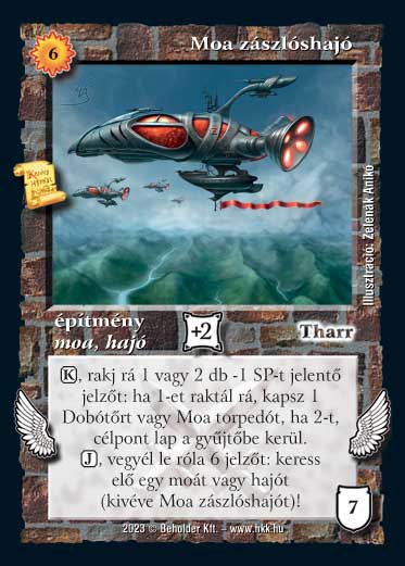 Szöveg: (K), rakj rá 1 vagy 2 db -1 SP-t jelentő jelzőt: ha 1-et raktál rá, kapsz 1 Dobótőrt vagy Moa torpedót, ha 2-t, célpont lap a gyűjtőbe kerül. (J), vegyél le róla 6 jelzőt: keress elő egy moát vagy hajót (kivéve Moa zászlóshajót)!
