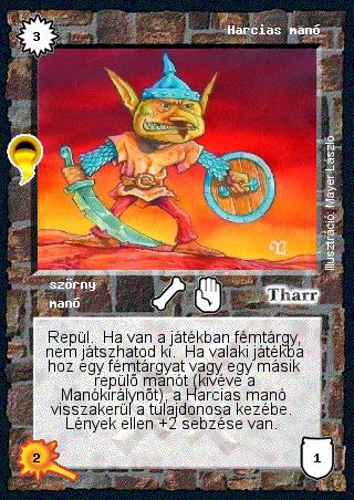 Szöveg: Repül. Ha van a játékban fémtárgy, nem játszhatod ki. Ha valaki játékba hoz egy fémtárgyat vagy egy másik repülő manót (kivéve a Manókirálynőt), a Harcias manó visszakerül a tulajdonosa kezébe. Lények ellen +2 sebzése van.