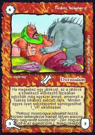 Kiadás: Alanori Krónika Gyakoriság: ritka Lapszín (isten): Dornodon Típus: szörny Szöveg: Ha megsebez egy játékost, az a játékos a következő előkészítő fázisában sebződik még egyszer annyit, amennyit a Tüskés bikaborz sebzett rajta. Minden egyes ilyen sebzéspontot semlegesíthet 1 VP elköltésével. Szinesítő szöveg: "Potkosz mosolyogva odasétált hozzá, közben lelkendezve kiabált: Milyen aranyos, egy nagyranőtt sündisznó!" - Zén: Hogyan fogyott el az expedíciónk c. feljegyzéseiből Illusztráció: Csikós György