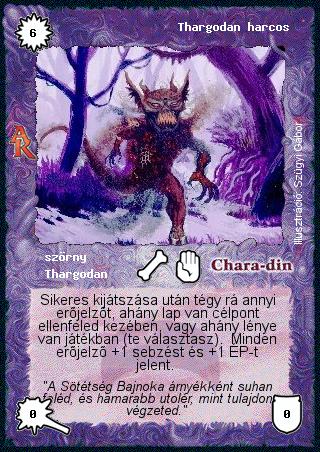 Kiadás: Alanori Krónika Gyakoriság: ritka Lapszín (isten): Chara-din Típus: szörny Altípus: Thargodan Szöveg: Sikeres kijátszása után tégy rá annyi erőjelzőt, ahány lap van célpont ellenfeled kezében, vagy ahány lénye van játékban (te választasz). Minden erőjelző +1 sebzést és +1 ÉP-t jelent. Szinesítő szöveg: "A Sötétség Bajnoka árnyékként suhan feléd, és hamarabb utolér, mint tulajdon végzeted." Illusztráció: