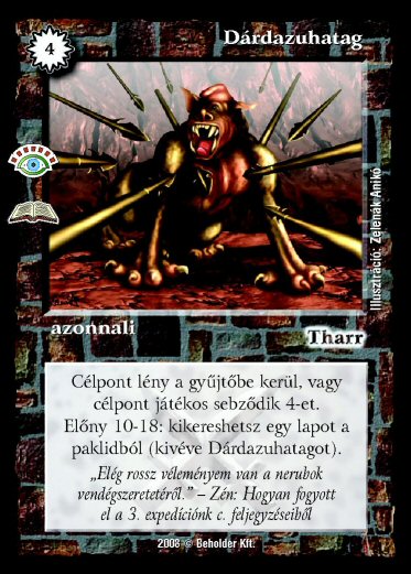 Szöveg: Célpont lény a gyűjtőbe kerül, vagy célpont játékos sebződik 4-et. Előny 10-18: kikereshetsz egy lapot a paklidból (kivéve Dárdazuhatagot).