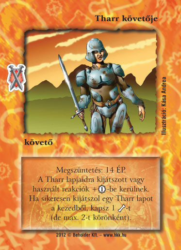 Szöveg: Megszüntetés: 14 ÉP. A Tharr lapjaidra kijátszott vagy használt reakciók +1_VP-be kerülnek. Ha sikeresen kijátszol egy Tharr lapot a kezedből, kapsz 1 _*-t (de max. 2-t körönként).