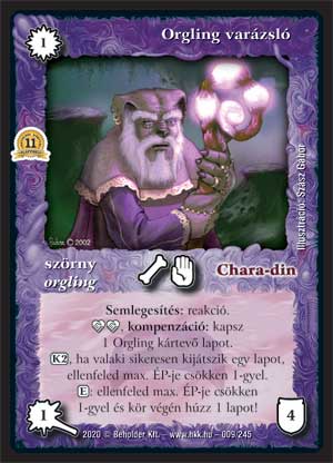Szöveg: Semlegesítés: reakció. _etnikum_etnikum, kompenzáció: kapsz 1 Orgling kártevő lapot. (K2), ha valaki sikeresen kijátszik egy lapot, ellenfeled max. ÉP-je csökken 1-gyel. (E): ellenfeled max. ÉP-je csökken 1-gyel és kör végén húzz 1 lapot!