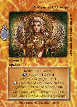 Szöveg: Kedvelt lap: angyal. (K2), áldozd fel X ÉP-d: célpont lény gyógyul X-et. (J): kijátszhatod egy gyűjtőben lévő angyalod, mintha a kezedben lenne.