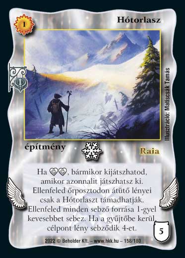 Szöveg: Ha _etnikum_etnikum, bármikor kijátszhatod, amikor azonnalit játszhatsz ki. Ellenfeled őrposztodon átütő lényei csak a Hótorlaszt támadhatják. Ellenfeled minden sebző forrása 1-gyel kevesebbet sebez. Ha a gyűjtőbe kerül, célpont lény sebződik 4-et.