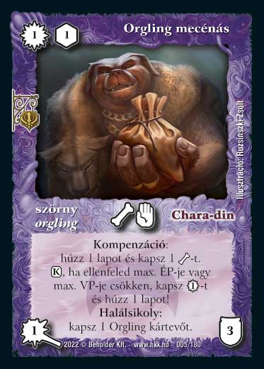 Szöveg: Kompenzáció: húzz 1 lapot és kapsz 1 _*-t. (K), ha ellenfeled max. ÉP-je vagy max. VP-je csökken, kapsz 1_VP-t és húzz 1 lapot! Halálsikoly: kapsz 1 Orgling kártevőt.