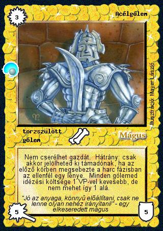 Kiadás: Két világ közt, Alappakli, 6. kiadás (Ősök Városa), Alappakli, 7. kiadás (Ősök Városa) Gyakoriság: nem gyakori Lapszín (isten): Mágus Klán Típus: torzszülött Altípus: gólem Szöveg: Nem cserélhet gazdát. Hátrány: csak akkor jelölheted ki támadónak, ha az előző körben megsebezte a harc fázisban az ellenfél egy lénye. Minden gólemed idézési költsége 1 VP-vel kevesebb, de nem mehet így 1 alá. Szinesítő szöveg: "Jó az anyaga, könnyű előállítani, csak ne lenne olyan nehéz irányítani!" - egy elkeseredett mágus Illusztráció: Mayer László