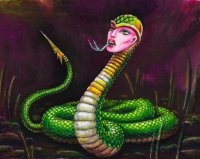 NANDA (224. SZÖRNY)A nandának gyönyörű női arca van: de sajnos a teste további része egy ocsmány kígyótest. A nandák nagyhatalmú, palotákban székelő úrnők, csak kevés, még nagyobb hatalmú entitás tud nekik parancsolni. A nanda pillantása igéző: az elbűvölt áldozat örülhet, ha a nanda csak valami értékesebb tárgyát veszi el, és nem az életét. |