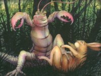 SZEPPENT RÁKFATTY (186. SZÖRNY)A dombvidékek szerény lakója ez a kutya méretű, rákollójú, gyíktestű, páncélos szörnyecske. Napközben általában egy szikla hűvösében húzódik meg, de éjszaka életre kél, vadászatra indul. Különös váladékot köp ellenfeleire, amely gyorsan megszilárdul, acélkemény börtönbe zárva a célpontot. Vigyázz, ha a váladék valamelyik tárgyadra fröccsen, hasonlóképp hasznavehetetlenné válhat, mint a technokolin bogár esetében! A szeppent rákfatty kemény páncélja ellen leginkább az ütőfegyver használható. |