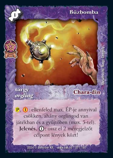 Szöveg: (P), (1): ellenfeled max. ÉP-je annyival csökken, ahány orglingod van játékban és a gyűjtőben (max. 5-tel). Jelenés, 1_VP: ossz el 2 méregjelzőt célpont lények közt!