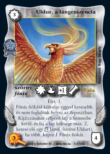 Szöveg: Élet: 1. Kijátszásakor célpont lap a Semmibe kerül, és ha a lap költsége max. 2, keress elő egy _tűz lapot (kivéve Uldurt), ha több, kapsz 1 Főnix fiókát. Főnix fiókáid költsége eggyel kevesebb, és nem foglalnak helyet az őrposztban.