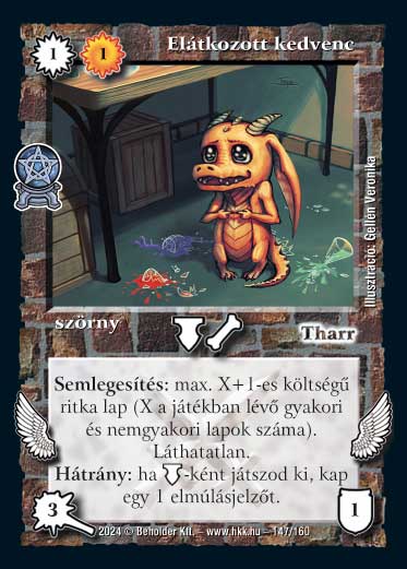 Szöveg: Semlegesítés: max. X+1-es költségű ritka lap (X a játékban lévő gyakori és nemgyakori lapok száma). Láthatatlan. Hátrány: ha _védekezés-ként játszod ki, kap egy 1 elmúlásjelzőt.