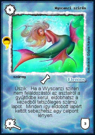 Szöveg: Úszik. Ha a Wyscanzi szirén nem feláldozástól az asztalról a gyűjtődbe kerül, eldobhatsz a kezedből tetszőleges számú lapot. Minden így eldobott lapért kettőt sebezhetsz egy célpont lényen.