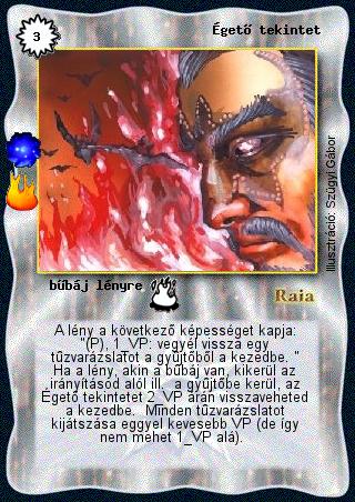 Szöveg: A lény a következő képességet kapja: "(P), 1 VP: vegyél vissza egy tűzvarázslatot a gyűjtőből a kezedbe. " Ha a lény, akin a bűbáj van, kikerül az irányításod alól ill. a gyűjtőbe kerül, az Égető tekintetet 2 VP árán visszaveheted a kezedbe. Minden tűzvarázslatot kijátszása eggyel kevesebb VP (de így nem mehet 1 VP alá).