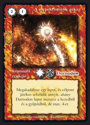 Szöveg: Megakadályoz egy lapot, és célpont játékos sebződik annyit, ahány Dornodon lapot mutatsz a kezedből és a gyűjtődből, de max. 4-et.