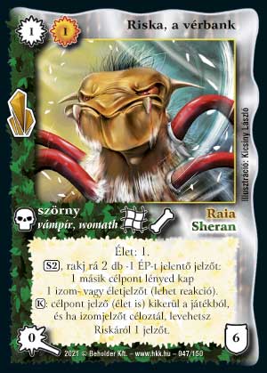 Szöveg: Élet: 1. (S2), rakj rá 2 db -1 ÉP-t jelentő jelzőt: 1 másik célpont lényed kap 1 izom- vagy életjelzőt (lehet reakció). (K): célpont jelző (élet is) kikerül a játékból, és ha izomjelzőt céloztál, levehetsz Riskáról 1 jelzőt.