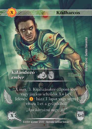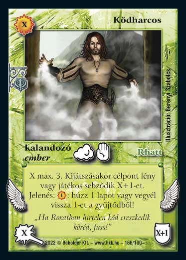 Kiadás: Roxat céhei, Védnök 2023 Gyakoriság: nem gyakori Lapszín (isten): Rhatt Típus: kalandozó Altípus: ember Szöveg: X max. 3. Kijátszásakor célpont lény vagy játékos sebződik X+1-et. Jelenés: (1): húzz 1 lapot vagy vegyél vissza 1-et a gyűjtődből! Szinesítő szöveg: "Ha Roxatban hirtelen köd ereszkedik köréd, fuss!" Illusztráció: Berényi Szabolcs