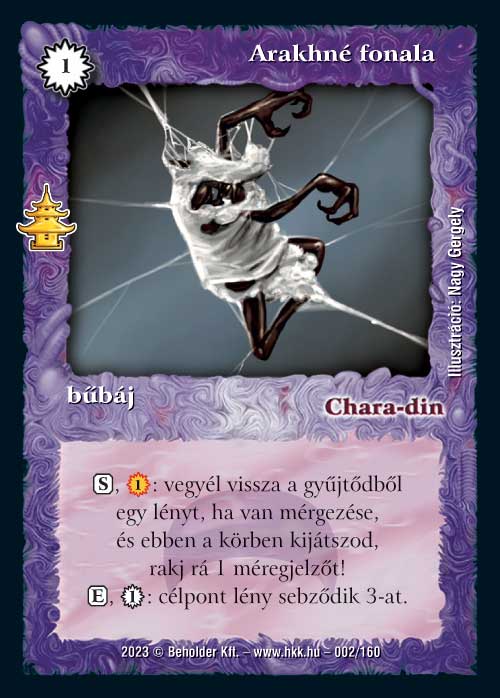 Ezt már csak mérgező pakliban tudom elképzelni (máshova azért kicsit drága), oda viszont mind ölésnek, mind késleltetett tömegirtásnak jó, ráadásul az új követővel a saját lapjainkhoz még muníciót is ad. Vegyük észre, hogy Arakhné mellett MINDEN lényünkre gond nélkül tehetjük a jelzőket, így bármilyen egyéb, jelzőkkel machináló kombó alapját is jelentheti ez a lap.