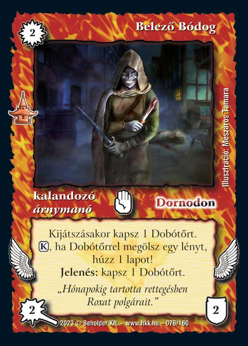 Creshif, az orgyilkos (7): A Roxati tolvajnő után újabb Dobótőrös reakció. Hasonló is a két lap, mindkettő akkor jó igazán, amikor már picit kiépültünk, ennek viszont van egy „titkos” fegyvere: 0 vp-s lapokat korábbi szakaszban is megfoghat. Nem hiszem, hogy ez elég lesz ahhoz, hogy másfajta paklikba bekerüljön, de a saját paklijában jó védelmi funkciót fog ellátni.