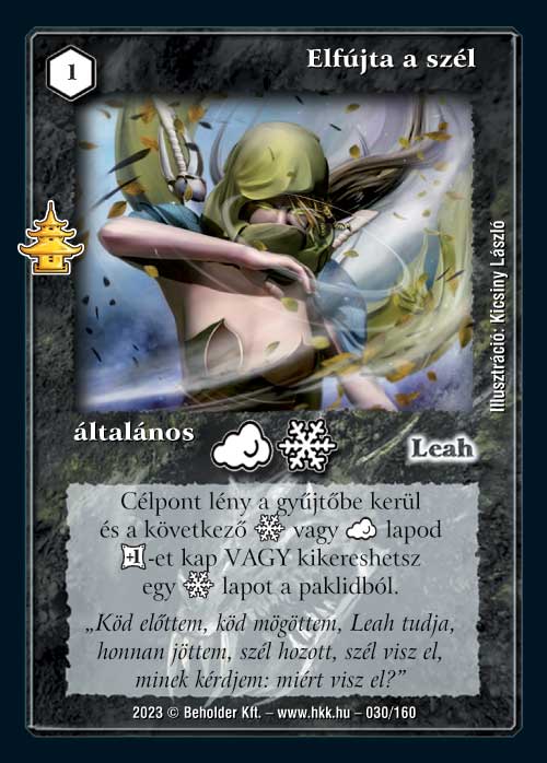 Elfújta a szél (9): Kicsit lehet meglepő lesz a pontszám, de szerintem ebben a lapban nagyon sok a lehetőség. Ahogy már a Valsirah oltalmánál elmondtam, egy speciális keresés nem csak az adott koncepció lapjainak a keresésére jó, hanem akár az adott ikonnal rendelkező univerzális lapokéra is, és azért a jeges vonalon bőven található ilyen (pl. Fagyorkán, Yeti csemete), ráadásul ez a lap rendelkezik még egy alternatívával is. Ködös koncepcióban pedig bérelt helye lesz. Meggyőződésem, hogy ezt a lapot fogjuk látni versenyeken.