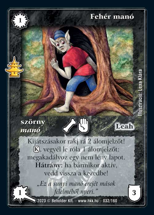 Fehér manó (7): Megint egy olyan lap, amiben szerintem van lehetőség, csak félek, hogy mivel nincs evidens paklija, nem fognak vele próbálkozni. Az ára nagyon rendben van és a képessége is nagyon trükkös, ugyanis vagy tudunk vele megfogni lapokat, vagy sakkban tartjuk vele az ellenfél nem-lény lapjait. A hátránya sem valódi hátrány, mert általában jobban járunk, ha kijátszhatjuk újra, mintha ütőlényként funkcionálna. E mellett az Otthonról szőtt álommal is érdekes kombót alkot. Ugyanakkor nálam ezzel együtt is inkább kiegészítő lap, mert lényes paklik ellen sokra nem megyünk vele, illetve az ilyen típusú lapoknak megvan az a hátránya, hogy az ellenfél már számít rá, így tudja a veszteségeit minimalizálni.
