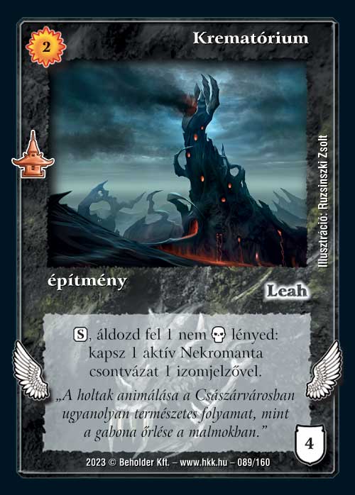 Krematórium (5): Érdekes lap lehet akár frissen bontotton, de egy Leah hordába is el tudom képzelni, főleg az izom miatt, az aktív Nekromanta csontváz izommal nagyobb védelmet és ütést is jelent, mint a legtöbb fekete lény.