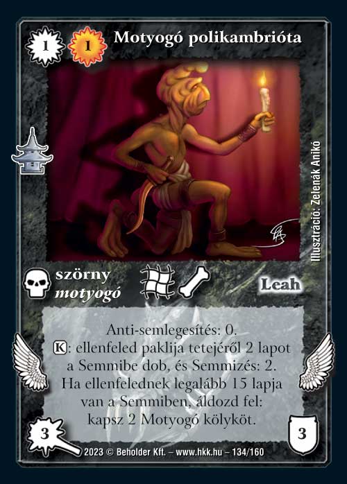 §• képességét használni, addig semmire nem jó (mindezt nem is túl olcsón). Utána már korrekt, de a Motyogó kölykök csak a pakliégetést segítik, amit a jelek szerint eddig is hatékonyan csináltunk, így kérdéses, hogy ebben mennyit számít az a +6 lap. Nekem jobban tetszenek azok a lapok, amik a kisebb pakliméretnél más képességet kapnak (pl. Motyogó szolga, Koplaló motyogó), ez picit vérszegény.