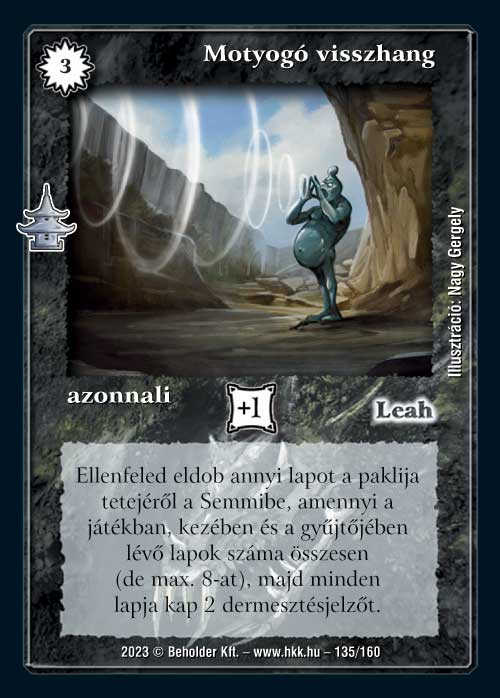 Motyogó visszhang (6): Szintén nem a legerősebb megoldó lap. A legnagyobb bajom a 8-as maximálással van, ha gonosz akarok lenni, ennyit a Szürkeállomány roncsolása is égetett 3 vp-ért több mint 20 évvel ezelőtt. Persze a fő képessége nem ez, de a másik funkció kapcsán meg az merül fel bennem, hogy miért használnám ezt, amikor van egy Hólavinánk. Külön-külön tehát mindkettő képességénél sokkal jobb funkciójú lapunk van, a kérdés, hogy vajon a kettő egybegyúrása lesz-e annyira izgalmas, hogy elővegyék a lapot. Nem meggyőződésem.
