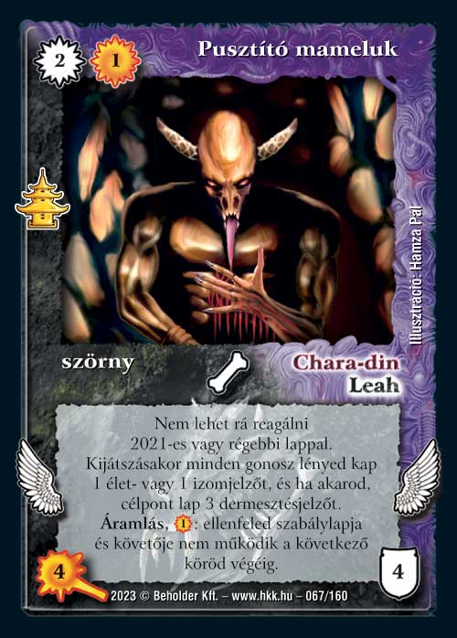 Az Adaptált xenomorf után egy újabb, narancs lapokat megoldó cucc. A Mameluk mellett szól, hogy nekem az 1 vp 1 zanszilánkos költség még akkor is sokkal jobban tetszik, hogyha csak egy rövidebb időre fogja meg a követőt, ráadásul üresben kitéve is hatékonyabb a lila lénynél. Viszont innentől jönnek a problémáim, amik leginkább az eredeti lappal összevetve érződnek: a régi verziójához képest mostanra a mameluk kétszínű lett. Ezt a jelentékeny gyengítés tetézi az, hogy a 2009-es 4/5-ös verzióhoz képest 2023-ban kapunk egy 4/4-es lényt 1,5 VP-vel olcsóbban, ill 1 izommal. Ezen felül az új verziónak van egy komolyabb dermesztés képessége, ami nem rossz, de azért nem is világmegváltó. Tehát nem érzem azt, hogy ez a lap egyértelműen és lényegesen erősebb lenne a korábbi verziónál, ami egy 15 éves lapnál elég nagy baj. Ráadásul ami előnye képességben az Adaptált xenóhoz képest megvan, annál nagyobb hátránynak tartom a két kötelező színt. Sajnos szerintem a leggyengébb ritkák egyike.