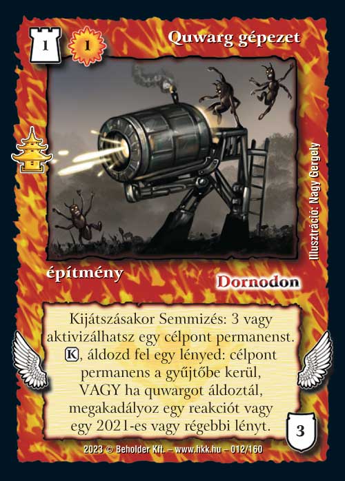 Quwarg gépezet (7): Ez már picit érdekesebb lap, mert akár máshova is beférhet. Persze kicsit azért erőltetett, mert építeni kell és kellenek hozzá lények is, de azért, ha mindez kijön, akkor a körönkénti leszedés már erős érv a használatához. Quwargok mellé meg azért is külön öröm, mert a Munkafelügyelővel is kereshető, és reagálni is tud. Viszont sajnos nem Keltető-kompatibilis, ami ennél az etnikumnál nem feltétlenül előny.