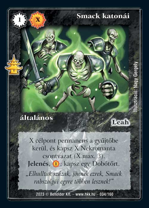 Smack katonái (7): Nem Leah kapta a legnagyobb erősítést ezzel a kiegészítővel. Teszem hozzá, nem is baj, a múltban azért sok erős lap jutott neki. Smack katonái újabb tömegirtásként jelenik meg, és megint a Hólvaina jut eszembe, amit azért szívesebben használnék. Ugyanakkor ennek a lapnak van egy olyan tókentermelő funkciója, ami akár Rox, akár Alvilág ura, akár Toborzó mellett hasznos lehet. Szóval azért itt van olyan pakli, amiben elférhet.
