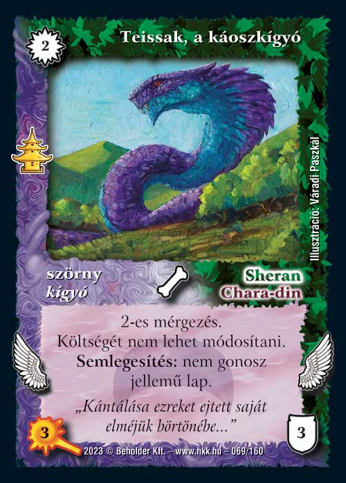 Szerintem nem rossz lap, bár a kétszínűsége ad némi bizonytalanságot. 2 vp önmagában nem annyira jó semlegesítés, ám az, hogy nem lehet a költségét módosítani, hatékonnyá teszi nemcsak a drágító szabálylapok mellett, de a reakciódrágítások ellen is kifejezetten jó. Mérgező pakliban próbálkoztam vele, ott nem volt rossz, de nagyon sok olyan alkalom volt, amikor biztosnak hittem egy 2-es reakciódrágításos lapom kijövetelében és egy Teissak keresztbe tett. Szerintem ebben a lapban van meglepetés. Ne feledkezzünk meg a lap parádés koncepciójáról, amit a név – illusztráció – színesítő szöveg szentháromság alkot.