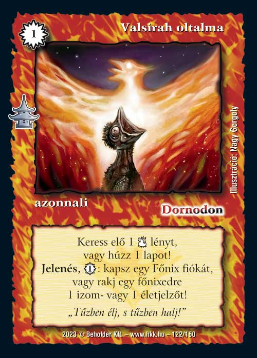Valsirah oltalma (8): A legutolsó csapás után egy újabb olcsó keresés. Ez jóval érdekesebb, ugyanis a főnixek közül több olyan is van, ami eléggé erős és nem csak a saját paklijában kap helyet (Tűztomboló, Vízfőnix, Oázisfészkelő), így ha néhányat ezekből használunk, már az is felvetheti ezt a lapot, főleg, mert nem csak keres, hanem még jelenésből is ad nekünk egy kis ajándékot. Jó ez a lap.