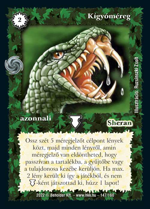 Kígyóméreg: Titkos favoritom volt ez a lap és most már látom, hogy egyben nagy tévedésem is. Azt továbbra is fenntartom, hogy lényes paklik ellen ez a lap hatalmasat tud menni, a baj csak az, hogy a lényes paklik annyira kiszorultak a metából, hogy a Kígyóméregnek még csak a használatán sem nagyon gondolkodtak el. Ha pedig megnézem, mik rotálnak ki Sheranból, akkor a továbbiakban sem jósolok neki sok jót. De annak örülnék a legjobban, ha megcáfolnátok.