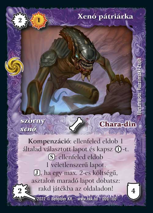 Xenó pátriárka: A Xeno mételyezőnél említettük, hogy – zanszilánk ide vagy oda – a 3 vp még sok. A Quwarg orákulumnál említettük, hogy jelenleg a Kreatív termik meg más erős dobatós ellenlapok miatt nem érdemes olyan lappal játszani, ami csak dobatni tud. Ezek után egy olyan lap, amire az előző két hátrány egyaránt jellemző, szinte predesztinálható volt, hogy a bukott lapok között fog kikötni. A xenó pakli maga korlátozott környezetben még meg is jelent, ám a Pátriárka oda sem igazán került be, máshova meg még kisebb eséllyel tudott beférni. Sajnálom, mert tesztelésen az egyik kedvenc lapom volt.
