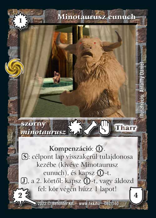 A mai napon nézzünk meg egy példányt a nem olyan régen, a feledés homályából visszarántott bikafejű teremtések közül is. A Minotaurusz eunuch viszi tovább a fajának szánt egyedi képességet, amivel asztalról, illetve gyűjtőből vehetünk vissza lapokat a kezünkbe. Mindezt teszi talán kicsit túl erős formában is. Amellett, hogy ez egy 1 varázspontos, ősmágiás lap, aminek 1 varázspontos kompenzációja van, még az §°-es képessége is varázspontot termel számunkra úgy, hogy engedi még egyszer megtolni egy másik lapunkat ebben a körben. És akkor még ott van a §•-s képessége is, ami további tempóval vagy lappal ajándékoz meg minket. Nemcsak bitang erős kiegészítő lap, de a saját paklijában és színén belül egy viszonylag korrekt végtelen kombót is rejteget egyik hasonszőrű társával, a Minotaurusz erénycsősszel (és akkor a Temetőt még nem is említettük). Sajnos ez a kombó valahogy elkerülte a figyelmünket a tesztelés során, ezért a lapról lemaradt a már Leiránál is bevált „Hátrány: ha a játékból a gyűjtőbe kerül, rakd a Semmibe!” mondat, de ez most utólag rákerült, így a roxatos Ongóliant diszkosszal együtt már kezd kibontakozni egy szép hagyomány, hogy minden kiegészítőben lesz egy lap, ami egy apró nerffel együtt érkezik még az első booster kibontása előtt. Ettől függetlenül a Minotaurusz eunuch egy nagyon erős kártya lesz továbbra és nehéz elképzelni, hogy nem lesz ott a kiegészítő top lapjai között.