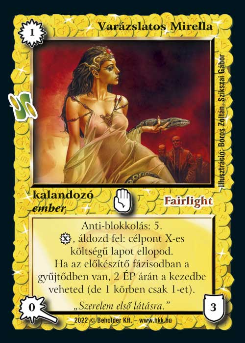 Ezen a varázslatos kedden kanyarodjunk kicsit a promóciós lapok irányába, és nézzük meg az egyik kódos kártyát, Varázslatos Mirellát. Talán első pillantásra nem egy nagyon erős lap, hiszen tulajdonképpen el tud lopni egy X-es kártyát eggyel drágábban, több lépésben. Ez eddig nem egy nagy dolog, hiszen tudtak már ilyet más lapok is olcsóbban. Na de jobban szemügyre véve az asszonyságot, azért egy igencsak idegesítő sor is feltűnik a lapon. Bizony ezt a kis tolvajlás dolgot minden körben képes megcsinálni, hiszen az előkészítő fázisban visszavehetjük őt a kezünkbe némi életpontért cserébe. Ráadásul ezzel a képességével egyúttal egy ilyen pofás dobatás elleni lappá is válik. Sokakat fog elcsábítani, de hát ki is állhatna ellen neki.
