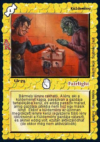 Kiadás: Alanori Krónika Gyakoriság: ritka Lapszín (isten): Fairlight Típus: tárgy Szöveg: Bármely lényre rakható. A lény, aki a küldeményt kapja, passzívan a gazdája tartalékjába kerül, és addig passzív marad, amíg gazdája játékba nem hoz egy másik lényt. Ekkor a küldemény az újonnan megidézett lényre kerül (egyszerre több lény idézésénél a Küldemény gazdája választ), és akinél eddig volt, ezután aktivizálódhat (de ekkor még nem aktivizálódik). Illusztráció: Szatmári Zsolt Tervező: Tuska Miklós