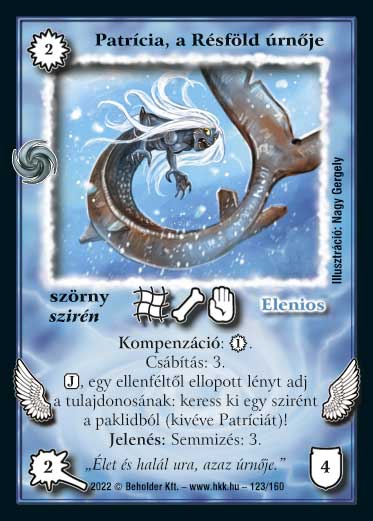 Szöveg: Kompenzáció: 1_VP. Csábítás: 3. (J), egy ellenféltől ellopott lényt adj a tulajdonosának: keress ki egy szirént a paklidból (kivéve Patríciát)! Jelenés: Semmizés: 3.