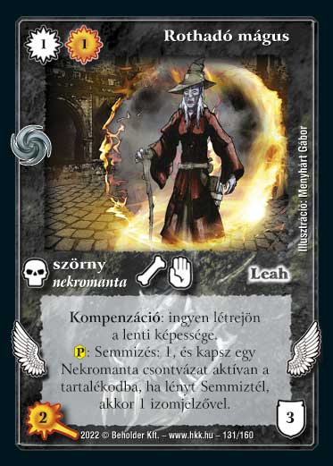 Szöveg: Kompenzáció: ingyen létrejön a lenti képessége. (P): Semmizés: 1, és kapsz egy Nekromanta csontvázat aktívan a tartalékodba, ha lényt Semmiztél, akkor 1 izomjelzővel.