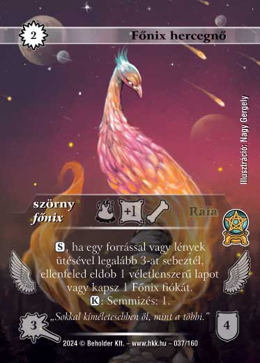 Szöveg: (S), ha egy forrással vagy lények ütésével legalább 3-at sebeztél, ellenfeled eldob 1 véletlenszerű lapot, vagy kapsz 1 Főnix fiókát. (K): Semmizés: 1.
