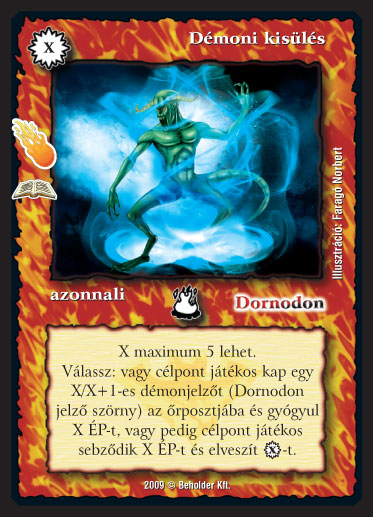 Szöveg: X maximum 5 lehet. Válassz: vagy célpont játékos kap egy X/X+1-es démonjelzőt (Dornodon jelző szörny) az őrposztjába és gyógyul X ÉP-t, vagy pedig célpont játékos sebződik X ÉP-t és elveszít X_VP-t.