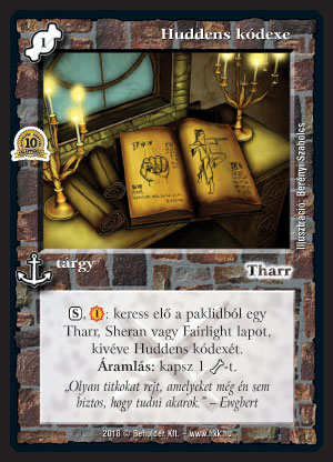 Szöveg: (S), (1): Keress elő a paklidból egy Tharr, Sheran vagy Fairlight lapot, kivéve Huddens kódexét. Áramlás: kapsz 1 _*-t.