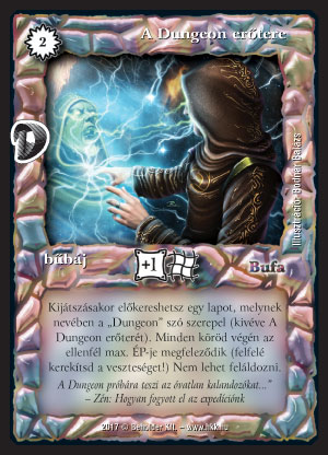 Szöveg: Kijátszásakor előkereshetsz egy lapot, melynek nevében a "Dungeon" szó szerepel (kivéve A Dungeon erőterét). Minden köröd végén az ellenfél max. ÉP-je megfeleződik (felfelé kerekítsd a veszteséget!). Nem lehet feláldozni.