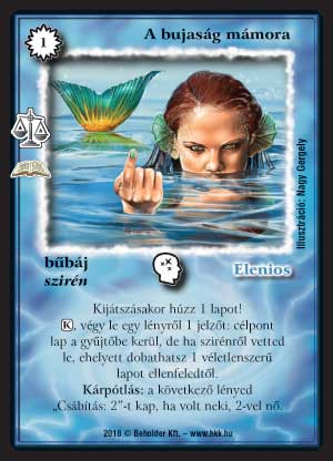 Szöveg: Kijátszásakor húzz 1 lapot! (K), végy le egy lényről egy jelzőt: célpont lap a gyűjtőbe kerül. Ha szirénről vettél le jelzőt, akkor ehelyett eldobathatsz egy véletlenszerű lapot ellenfeledtől. Büntetés: a következő lényed csábítása megnő 2-vel.
